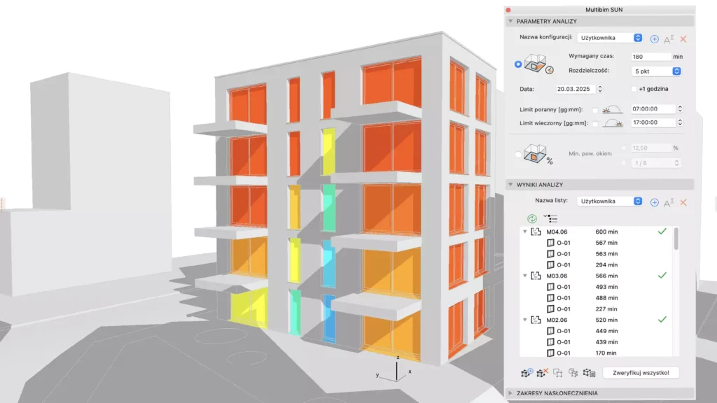 Multibim SUN to nowoczesne narzędzie, które całkowicie zastępuje tradycyjną linijkę słońca, wykorzystując model 3D Archicada, dokładne dane geograficzne oraz automatyczne obliczenia. Analizę nasłonecznienia wykonasz jednym kliknięciem – bez ręcznych pomiarów i ryzyka błędów.