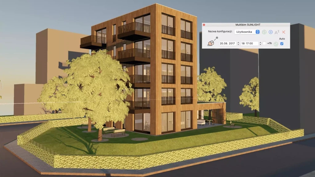 Nasze darmowe narzędzie Multibim SUNLIGHT pozwala na precyzyjne sterowanie datą i godziną oświetlenia w oknie 3D Archicada z podglądem na żywo. Świetnie sprawdza się w prezentacji wyników analizy nasłonecznienia narzędziem SUN.