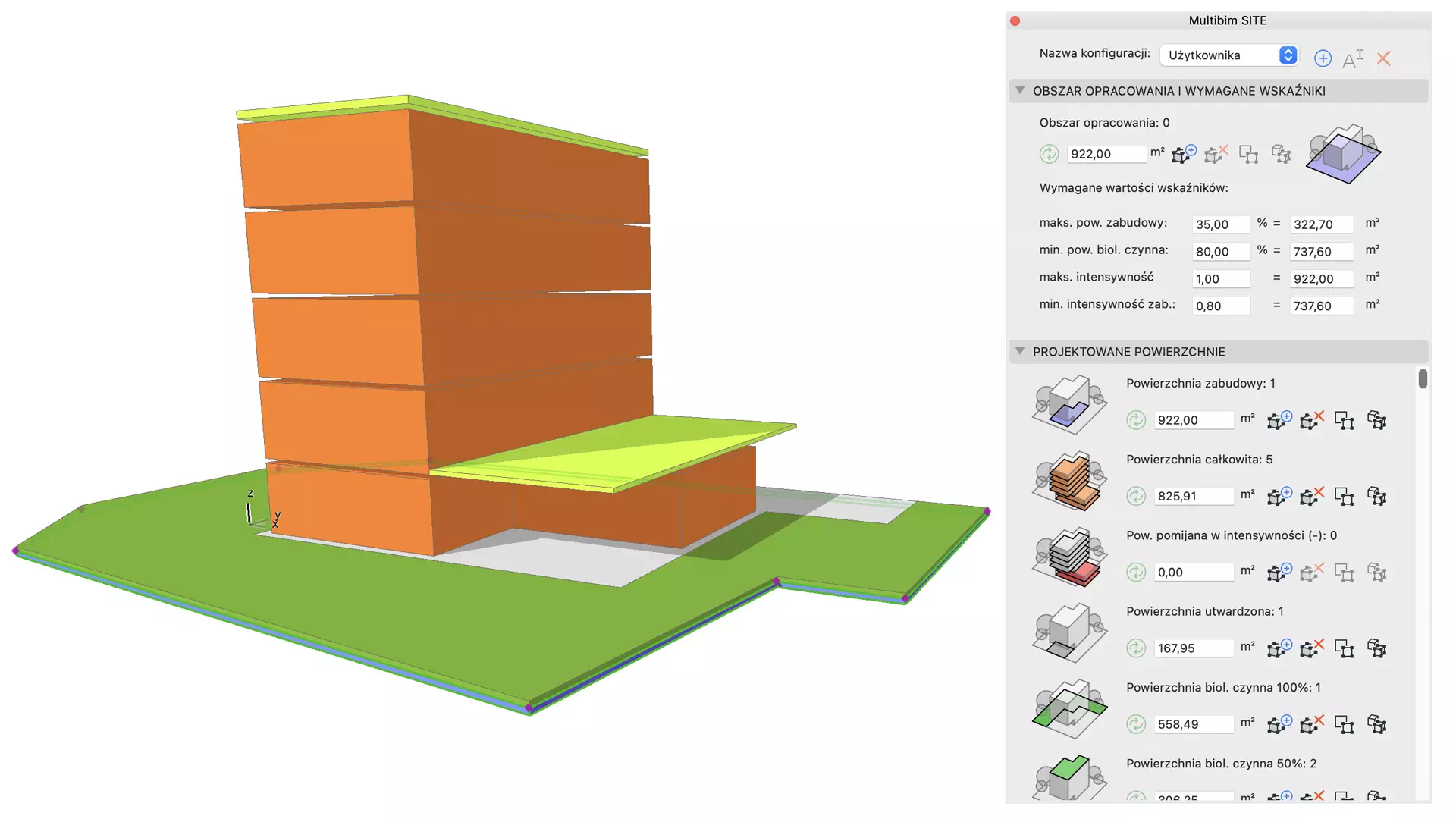 Narzędzie Multibim SITE automatyzuje bilansowanie zagospodarowania terenu oraz oblicza chłonność działek. Wszystkie wskaźniki urbanistyczne aktualizują się automatycznie wraz ze zmianami w projekcie.